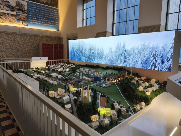 Inovativna interaktivna maketa opremljena z realističnimi 3D modeli, računalniško kontroliranimi LED svetili, LED zaslonom in dodatnimi informativnimi zasloni na dotik.