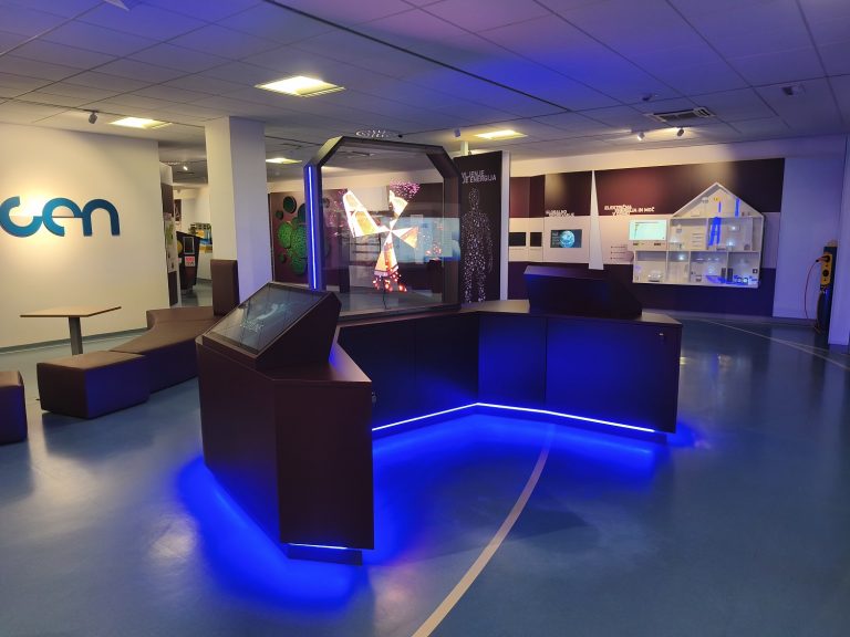 Interaktivna aplikacija za informativni zaslon v avli podjetja GEN Energija, pregledovalnik vsebin se upravlja z gibi s tehnologijo Kinect.