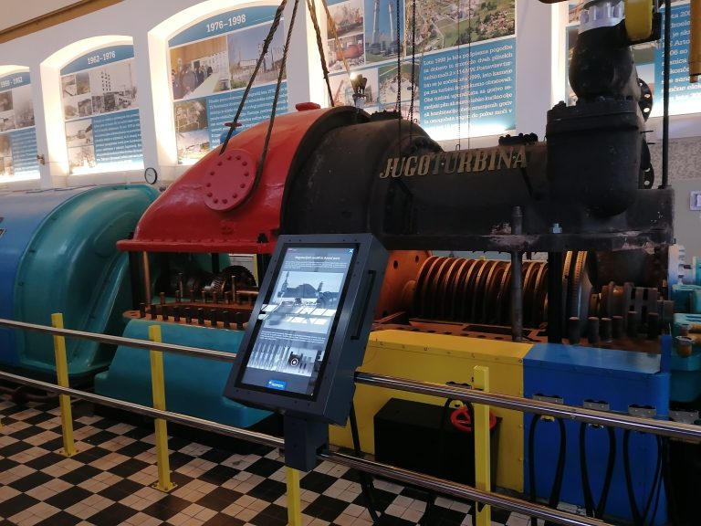 Premikajoč zaslon na dotik ob stari parni turbini (Jugoturbina) prikazuje delovanje turbine in začetke proizvodnje električne energije v Termoelektrarni Brestanica.